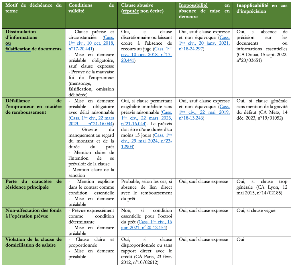 Laclause de déchéance du termepermet à la banque d’exiger le remboursement immédiat du capital restant dû en cas de manquement de l’emprunteur à ses obligations.Néanmoins,toutes les clauses de déchéance du terme ne sont pas valables, et leur mise en œuvre doit respecter de précises conditions de forme et de fond.